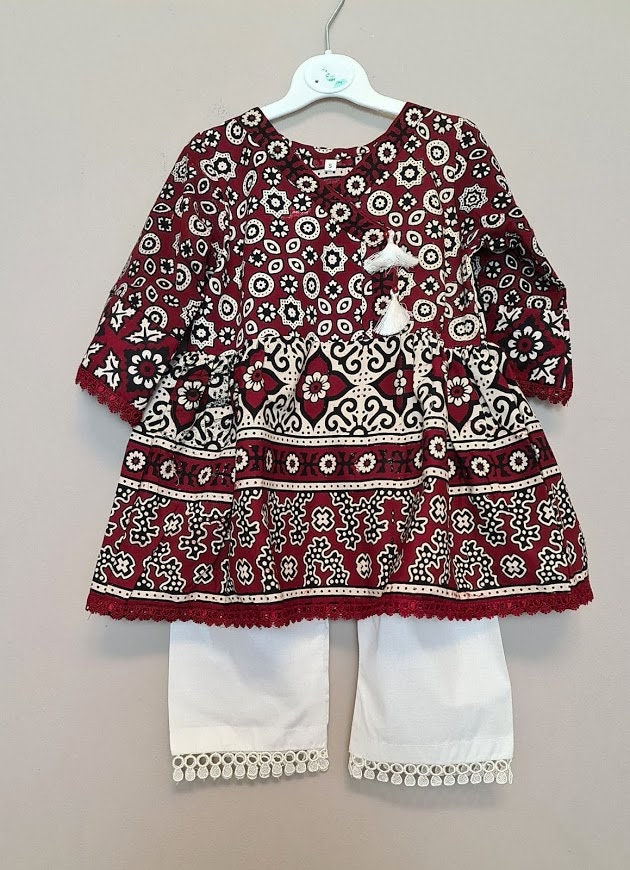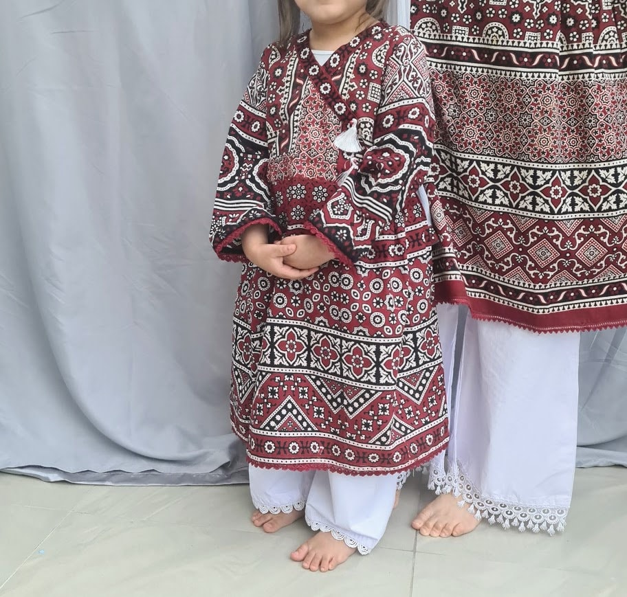 Kids Afghani Dress: Girls' Ajrak Print Shalwar Kameez