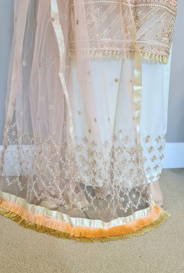 Our Handmade Pakistani Anarkali Salwar Kameez is made from the finest materials and meticulously stitched. With stunning pearls, threadwork, and sequins the dress is no doubt made with utmost special care for your satisfaction!