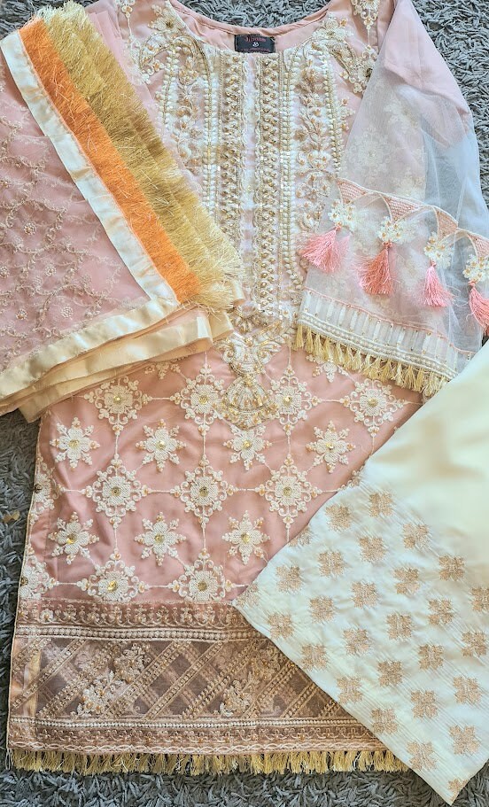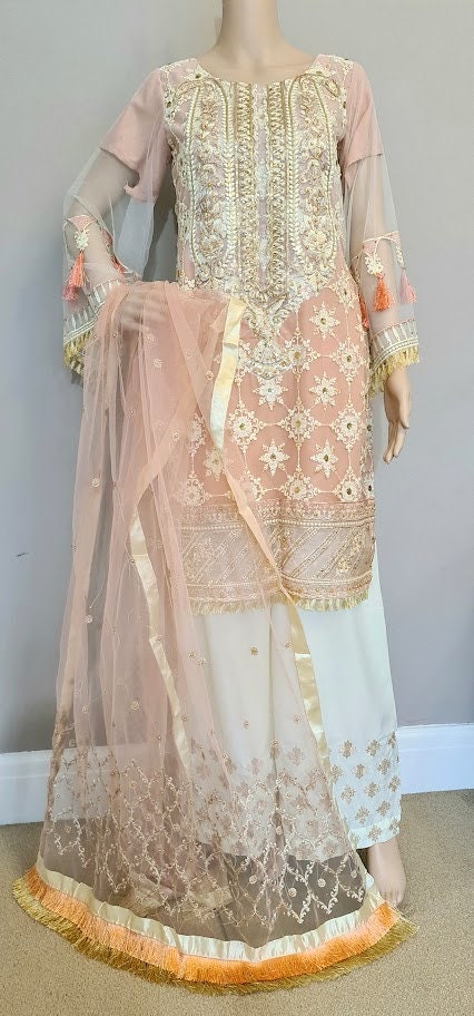 [1x Indian Salwar Kameez net Dress (1x net Embroidered Dress, 1x Dupatta Shawl, & 1x Plain Trousers]