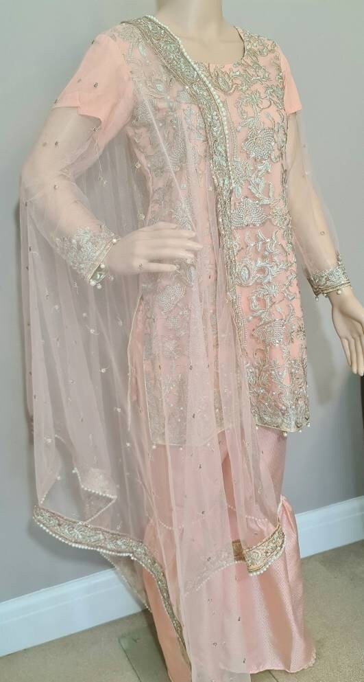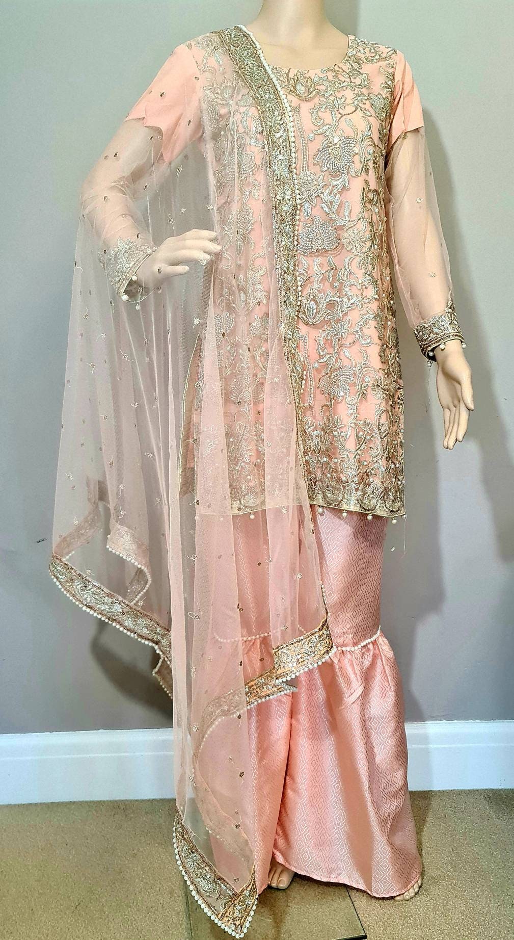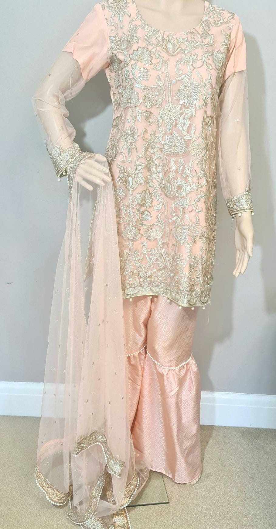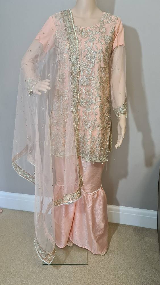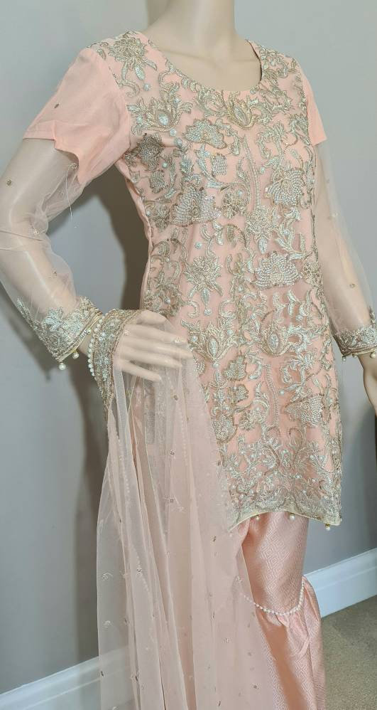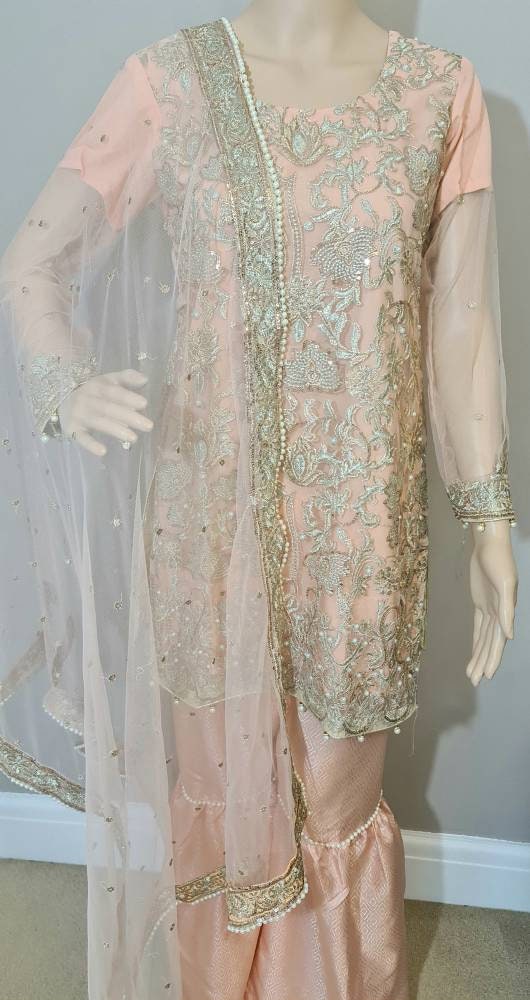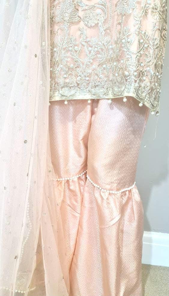 Pakistani dress Embroidered Net pearls , Garara Trousers, Readymade Salwar Kameez peach colour