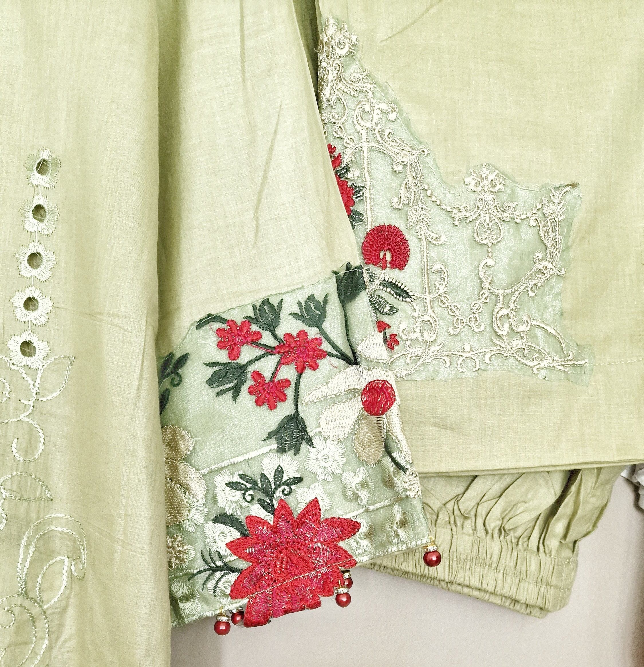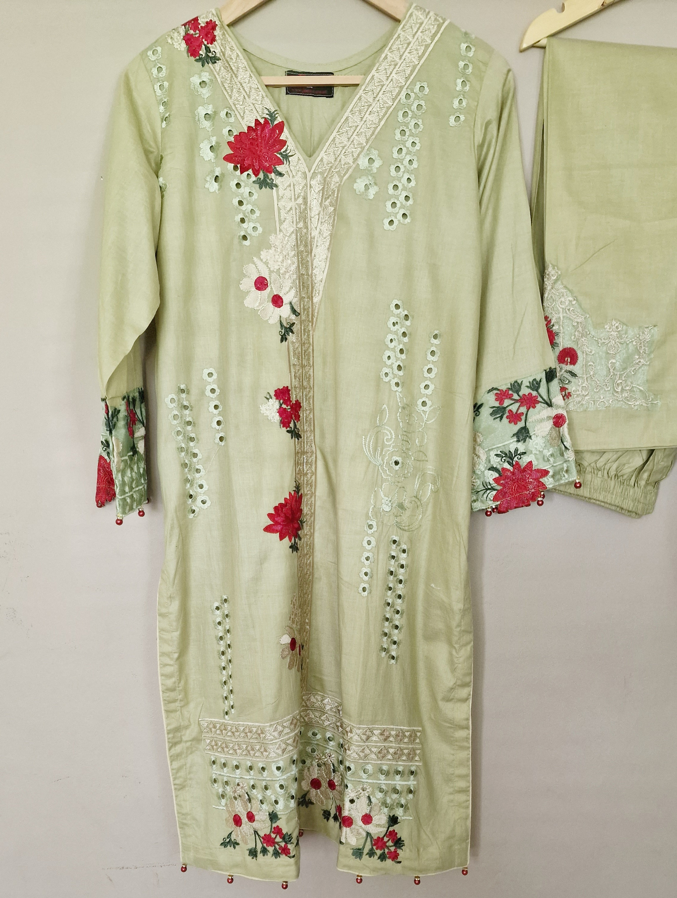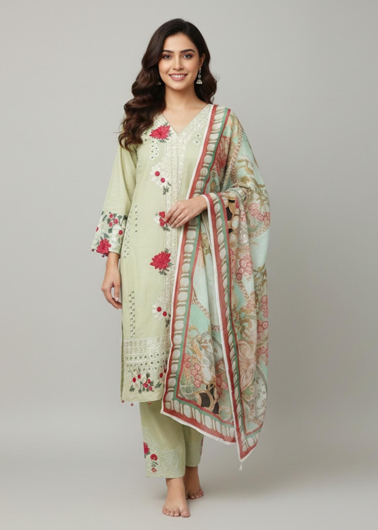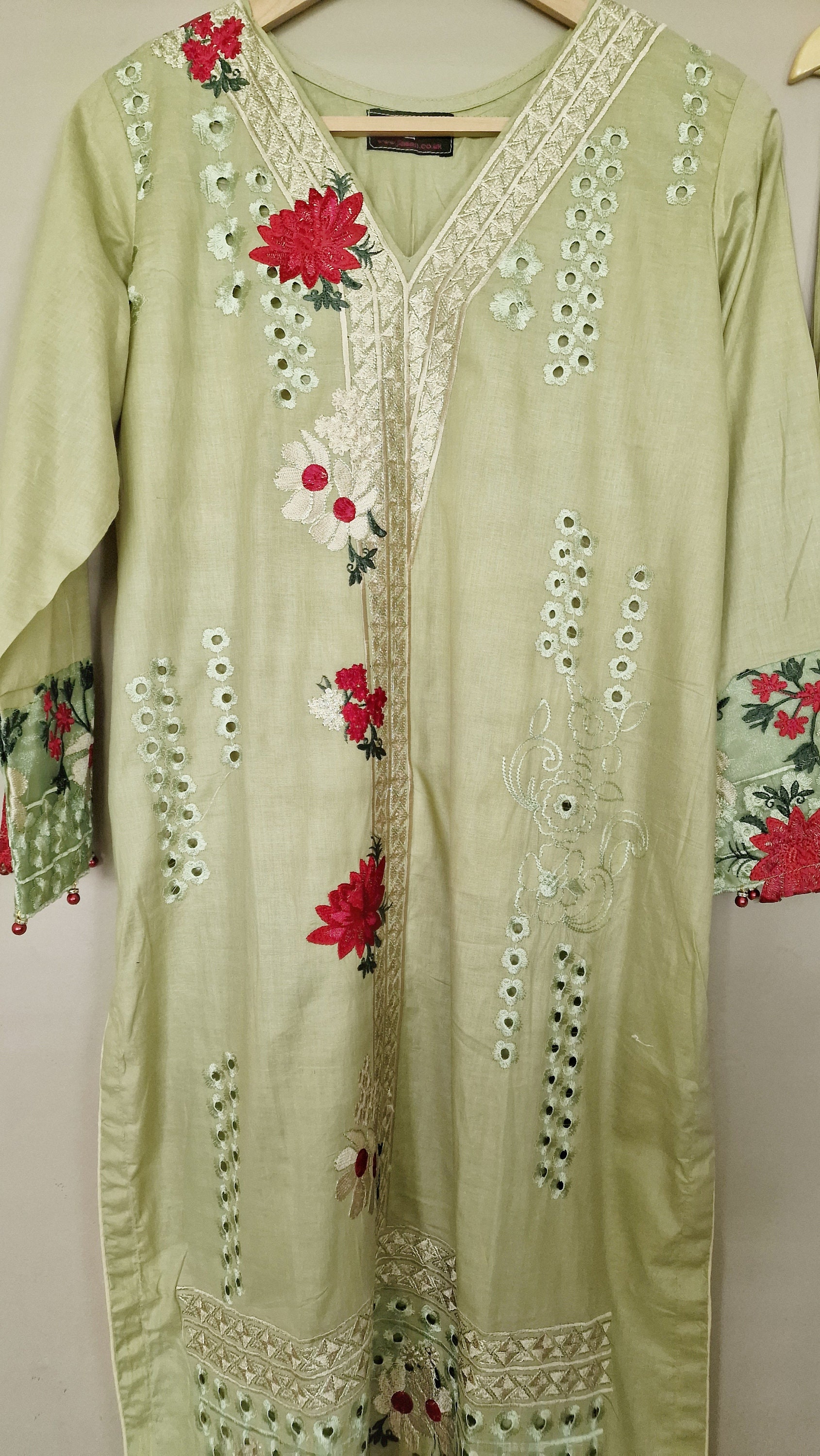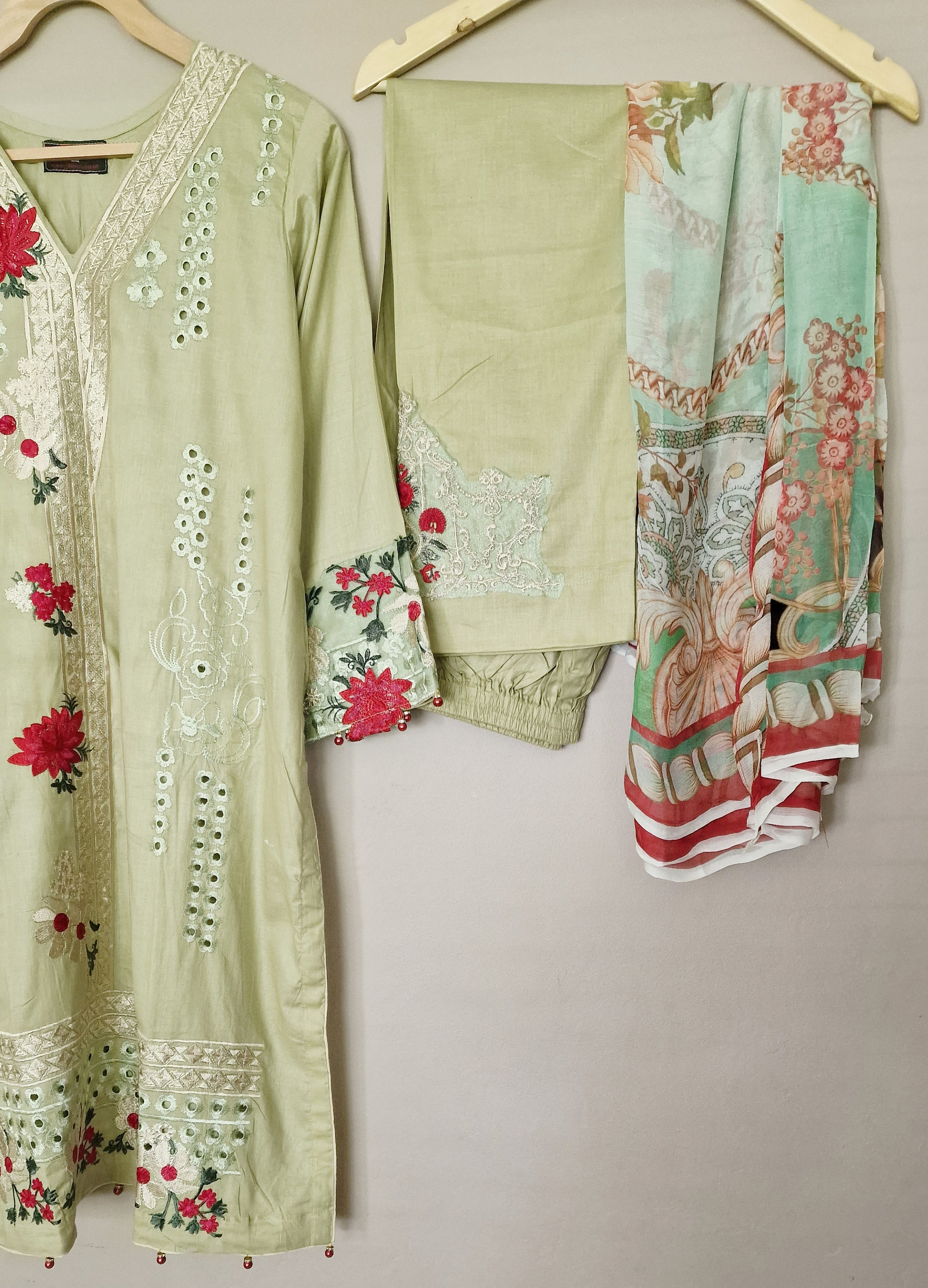Pakistani dress Embroidered Lawn green Salwar Kameez, Printed Chiffon Scarf, Ready to Wear ethnic wear for women