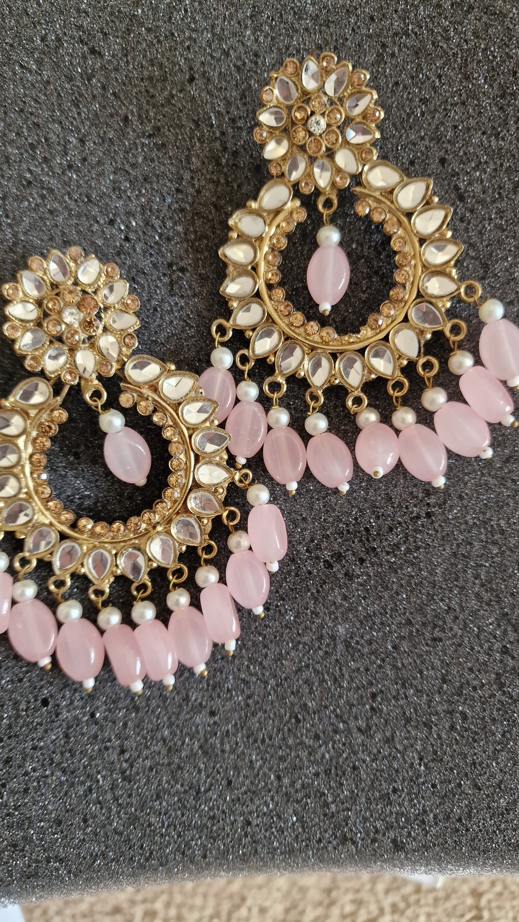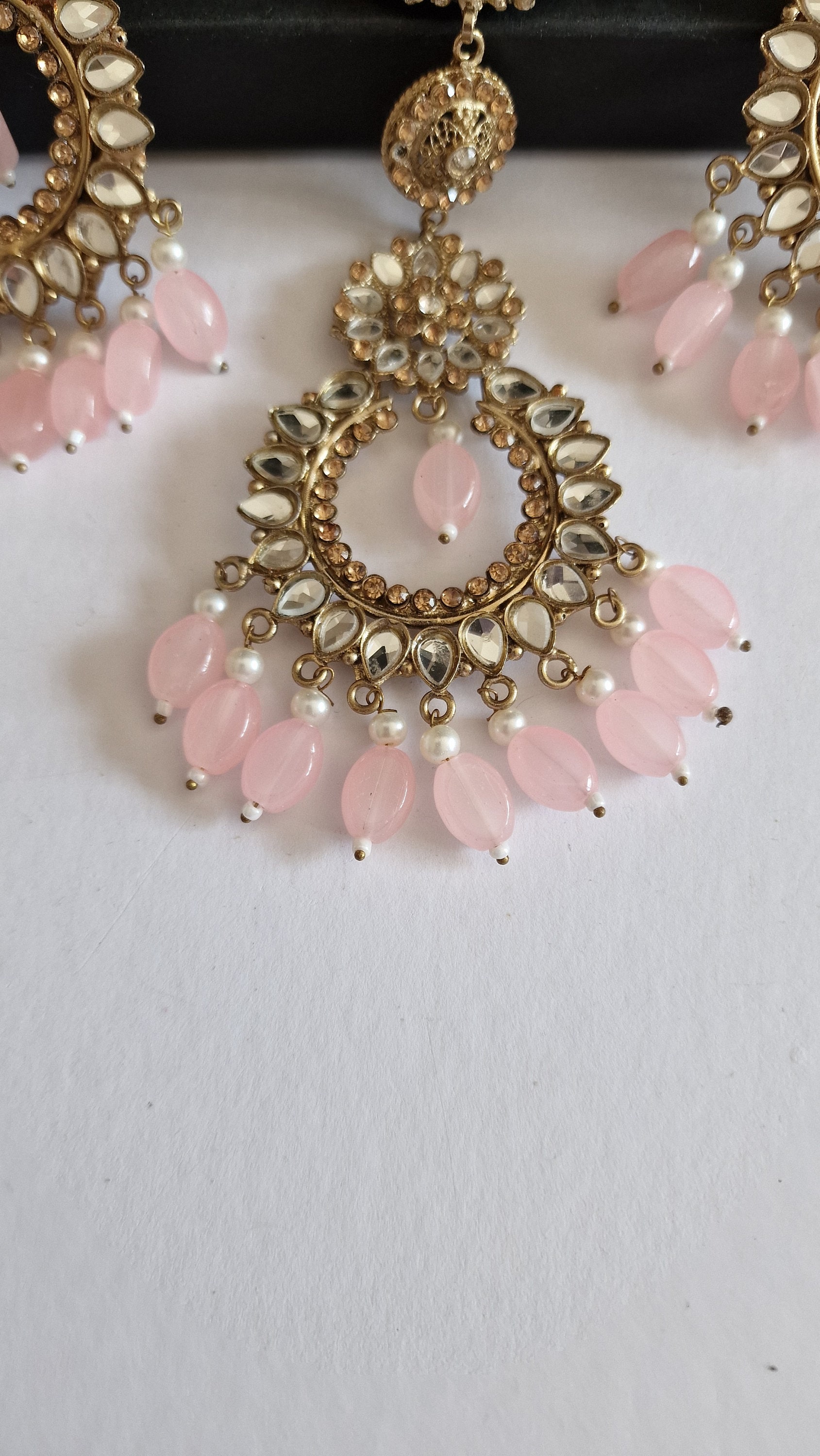 Beautifully hand crafted indian jewelry earrings and matha patti set in gold finish pearls and diamante encrusted...
