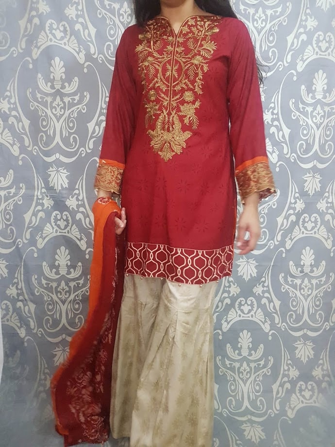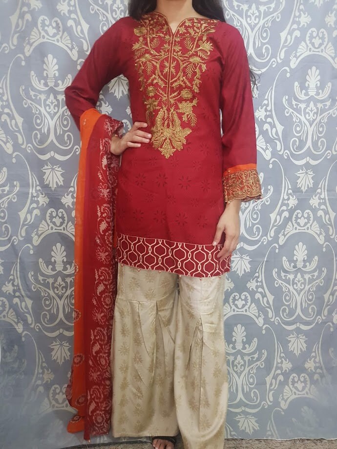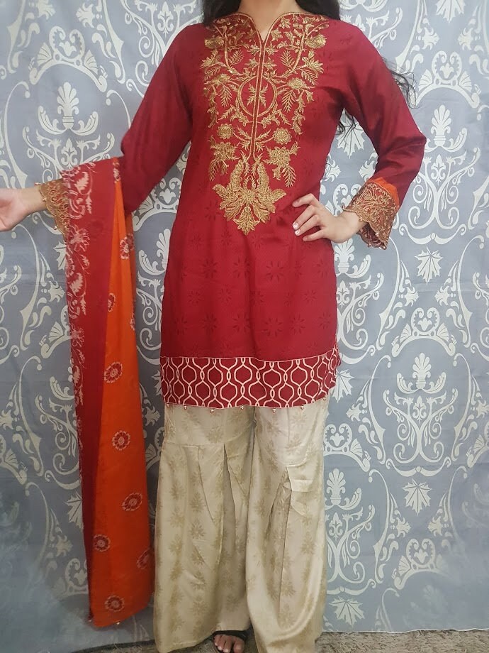 beautifully stitched PAKISTANI DRESS, embroidered kameez and scarf this indian dress is for any occassion it is readymade and available in all sizes