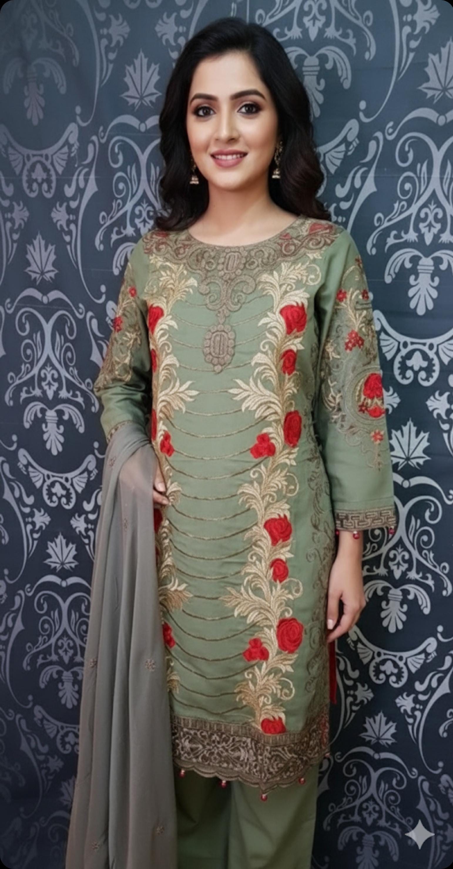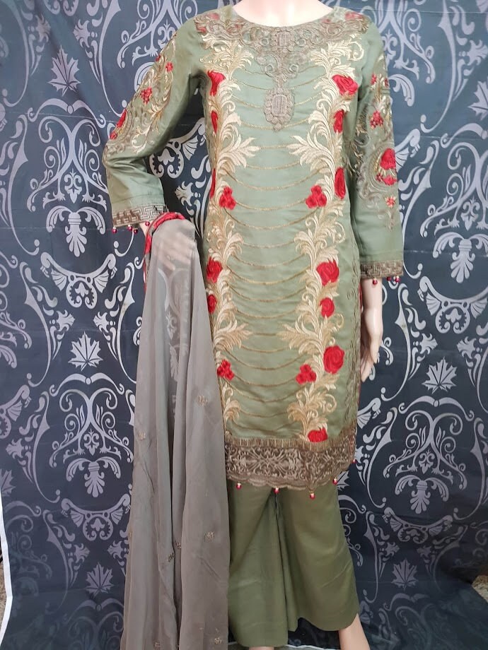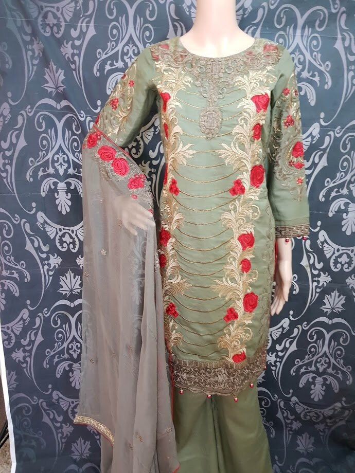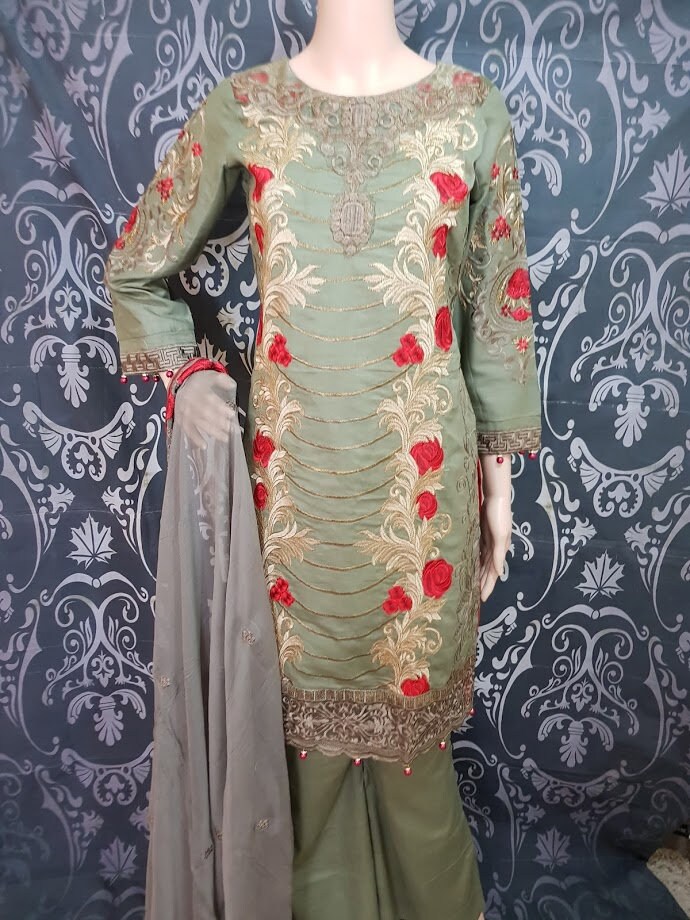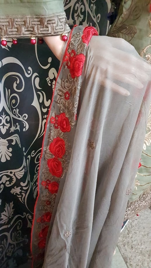 beautifully stitched pakistani dress salwar kameez with neck embroidery delicately embroidered shirt with trousers and a large scarf FULLY EMBROIDERED and hanging pearls details