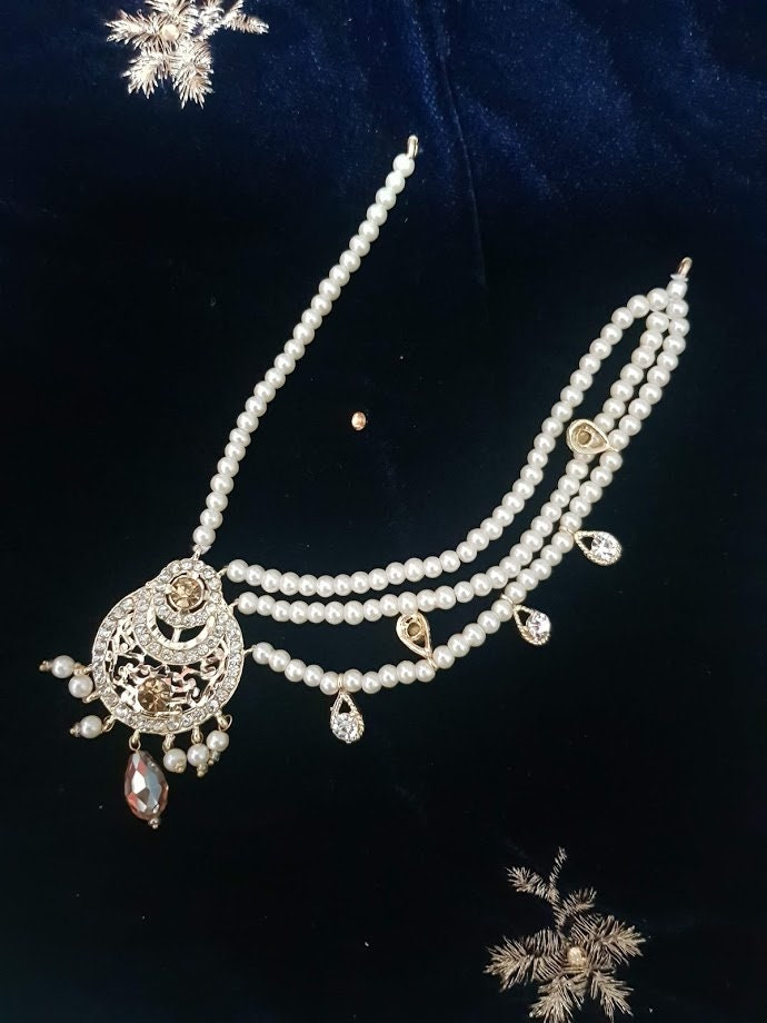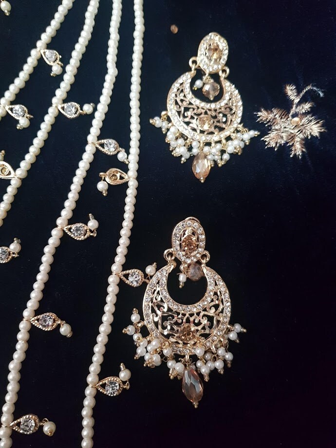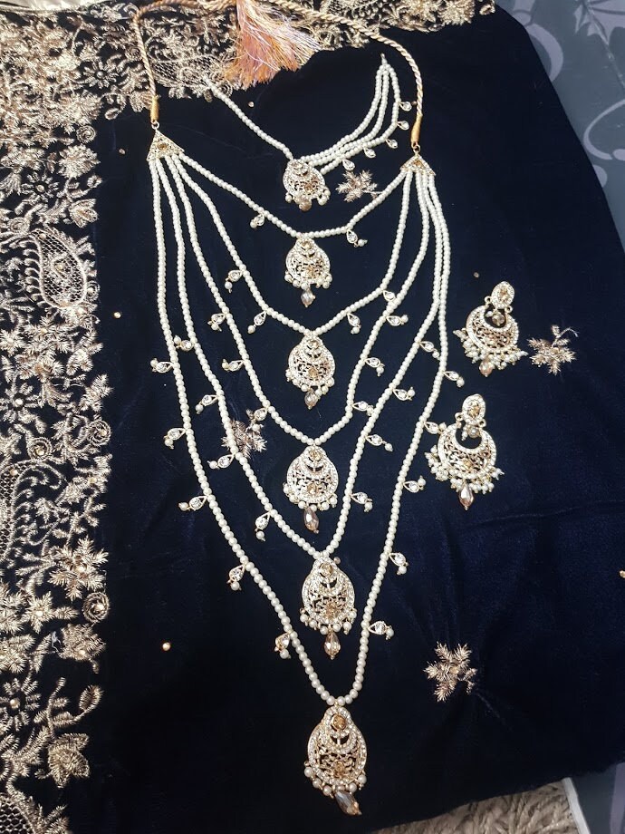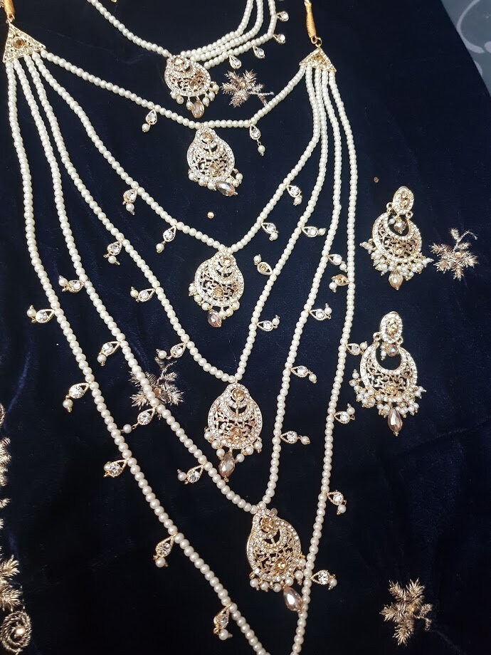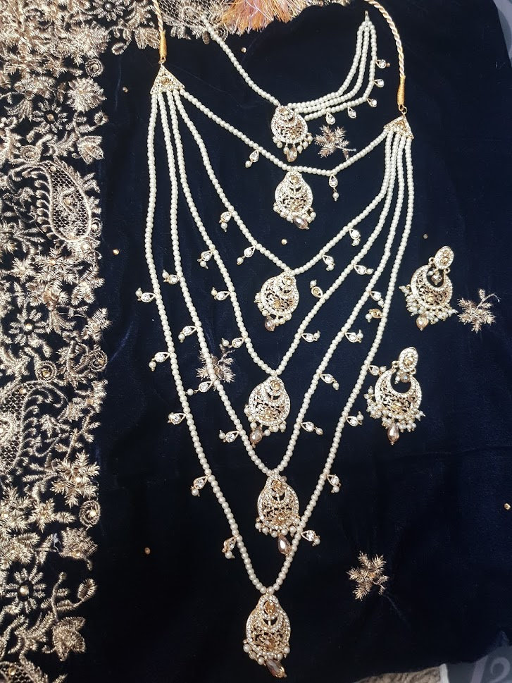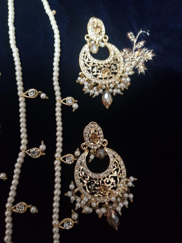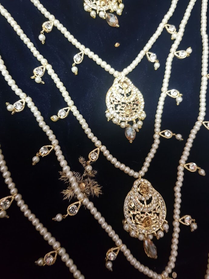 Beautifully hand crafted pakistani jewelry long raani haar maala in gold and champagne crytals a beautiful combination of pearls crystals and diamante... this high quality set will compliment any dress