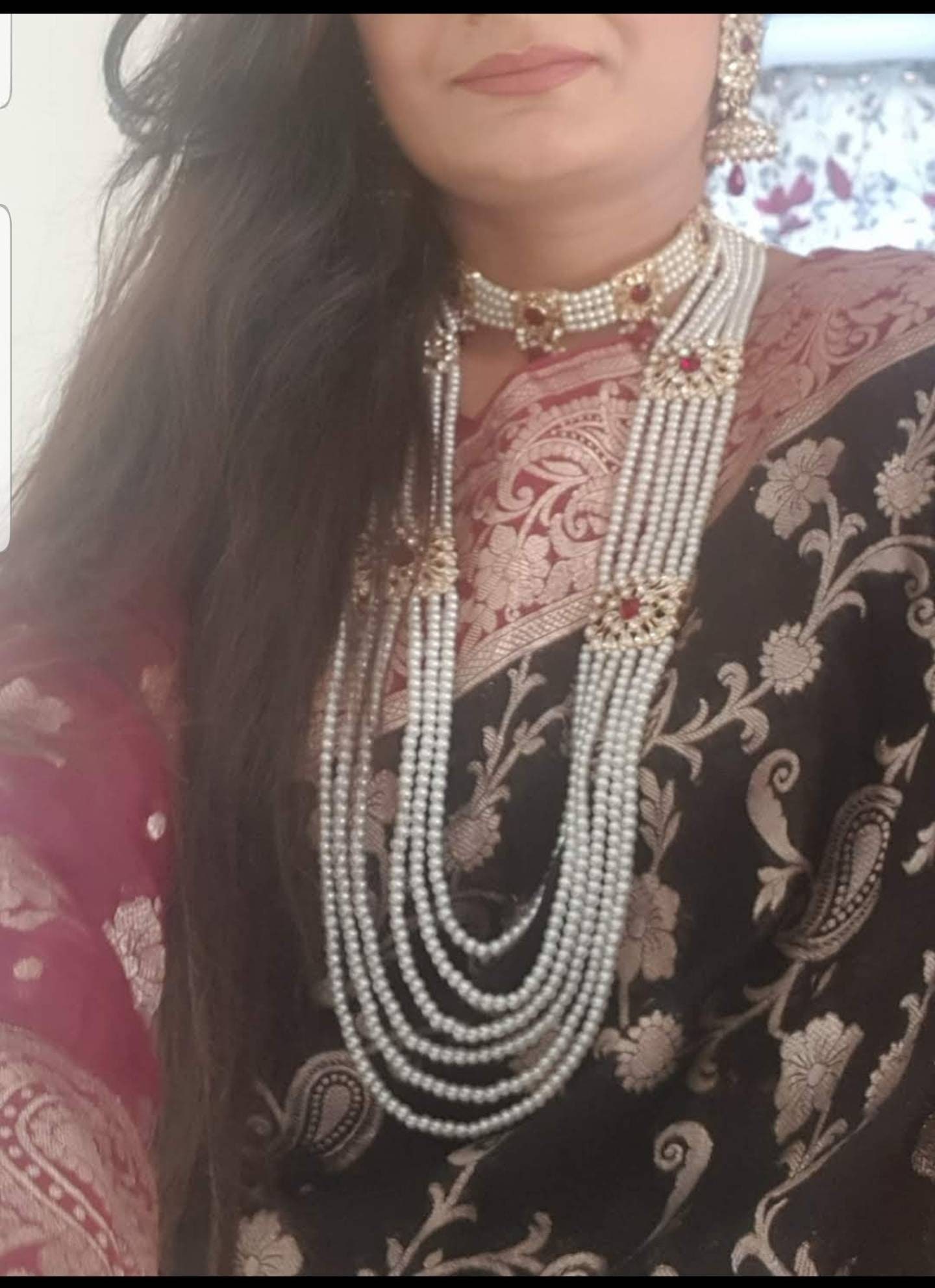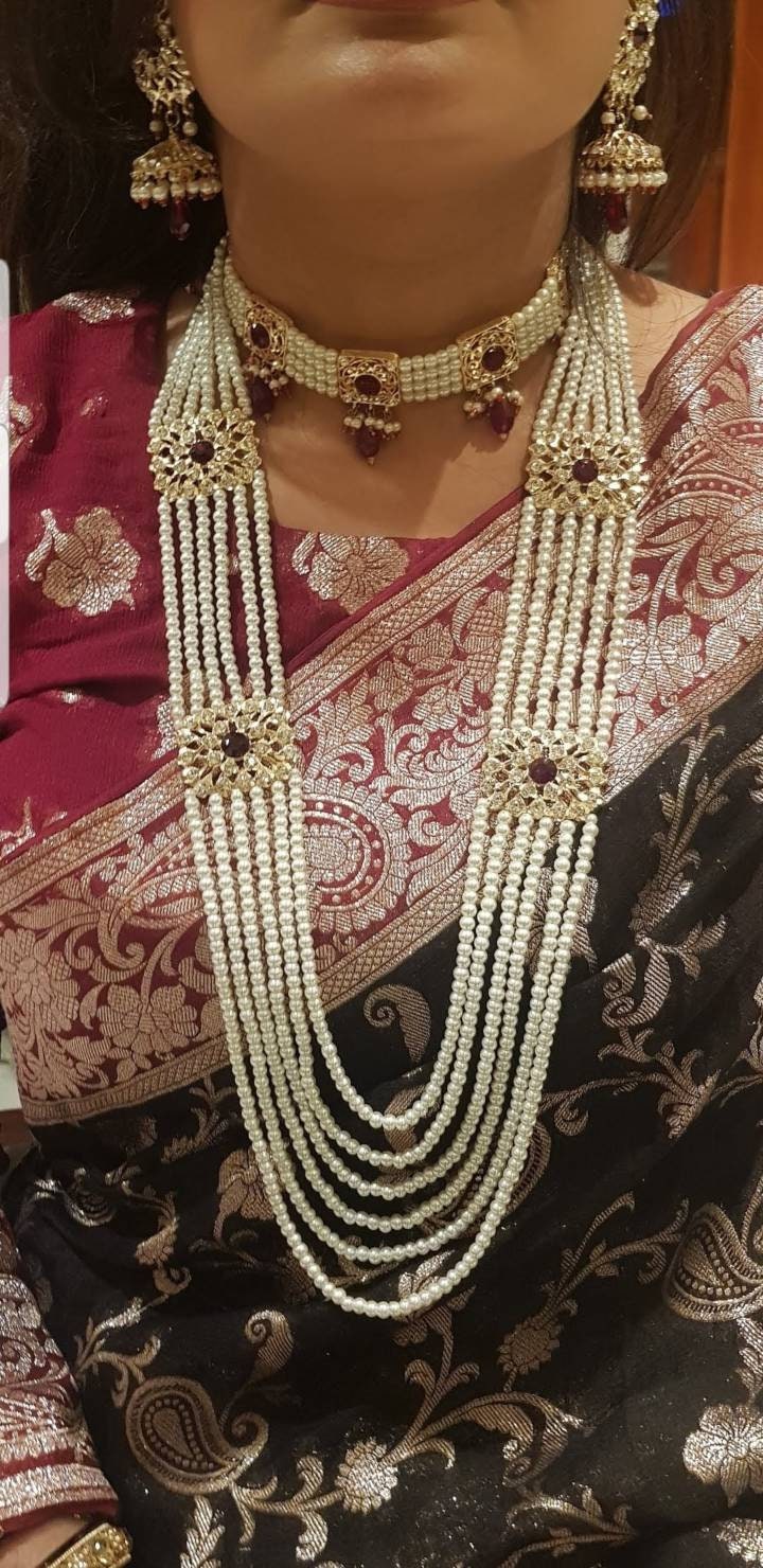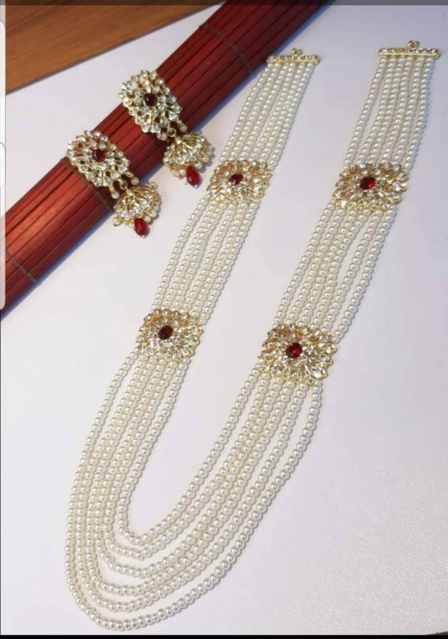 Beautifully hand crafted long pearl maala in gold and red details finish diamante encrusted set...