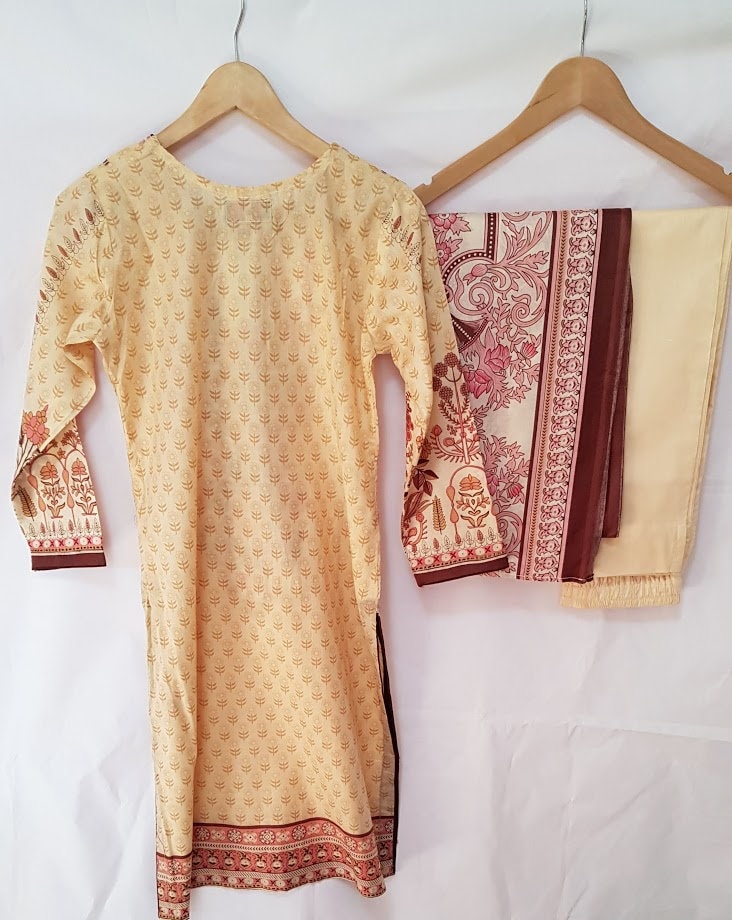 beautifully stitched dress with intricate embroidery on neck, printed sleeves,lawn printed dupatta/scarf, lawn trousers