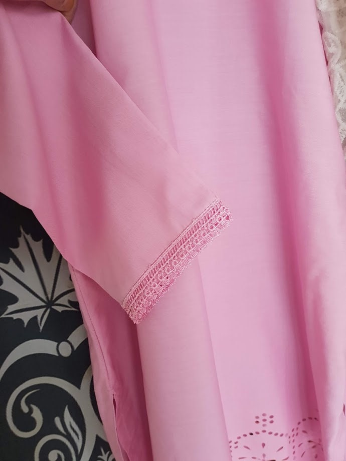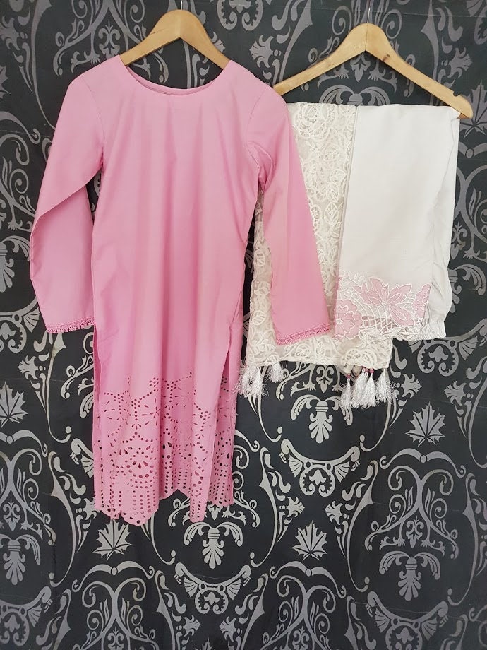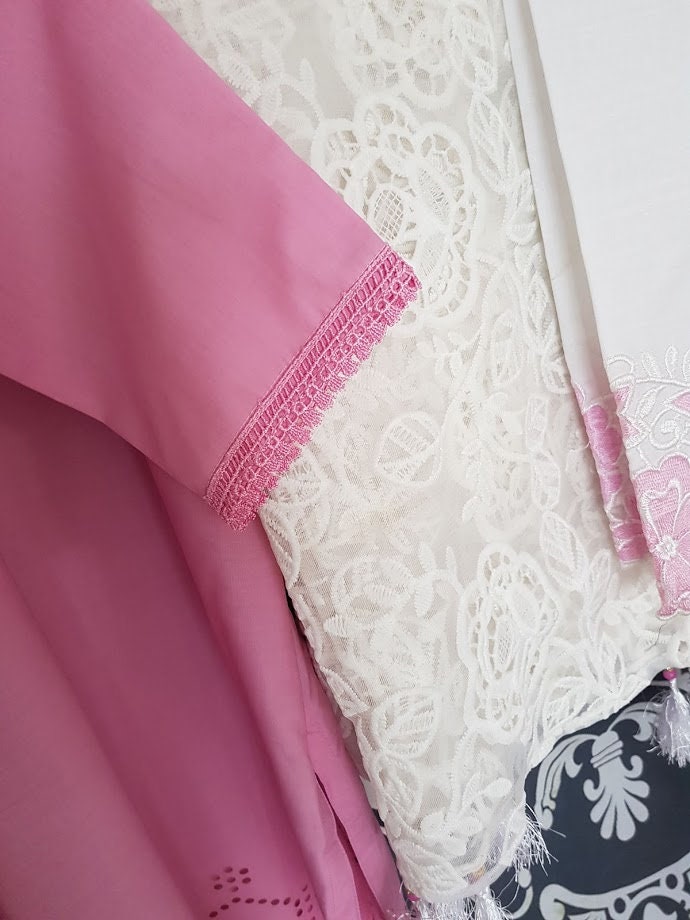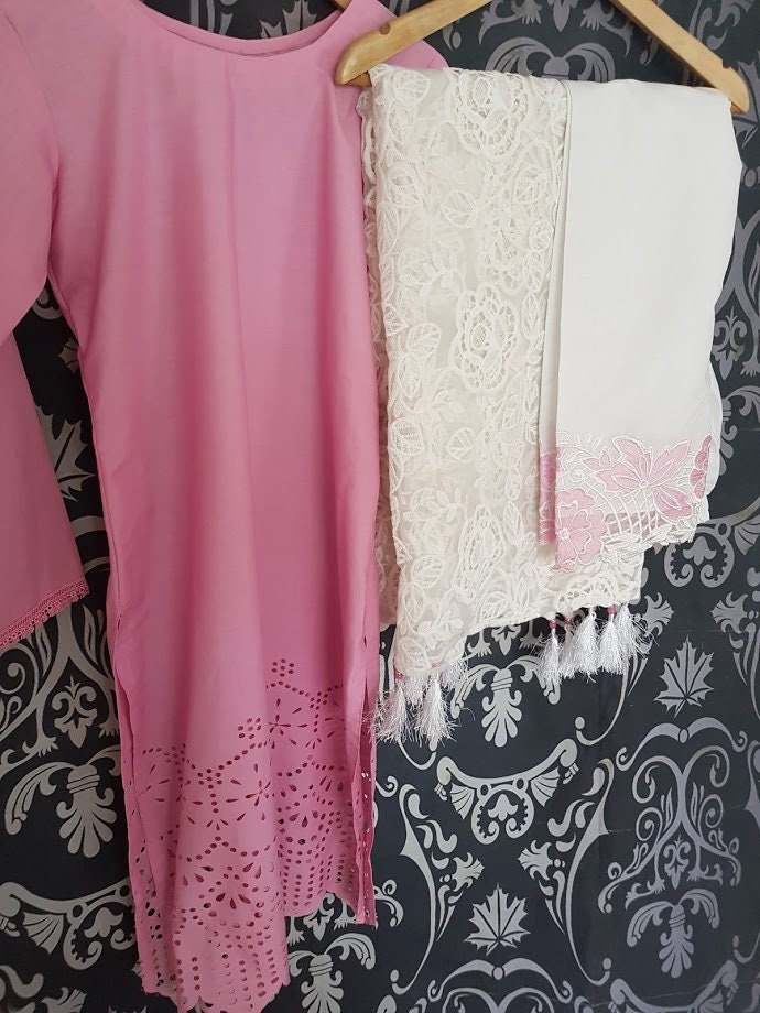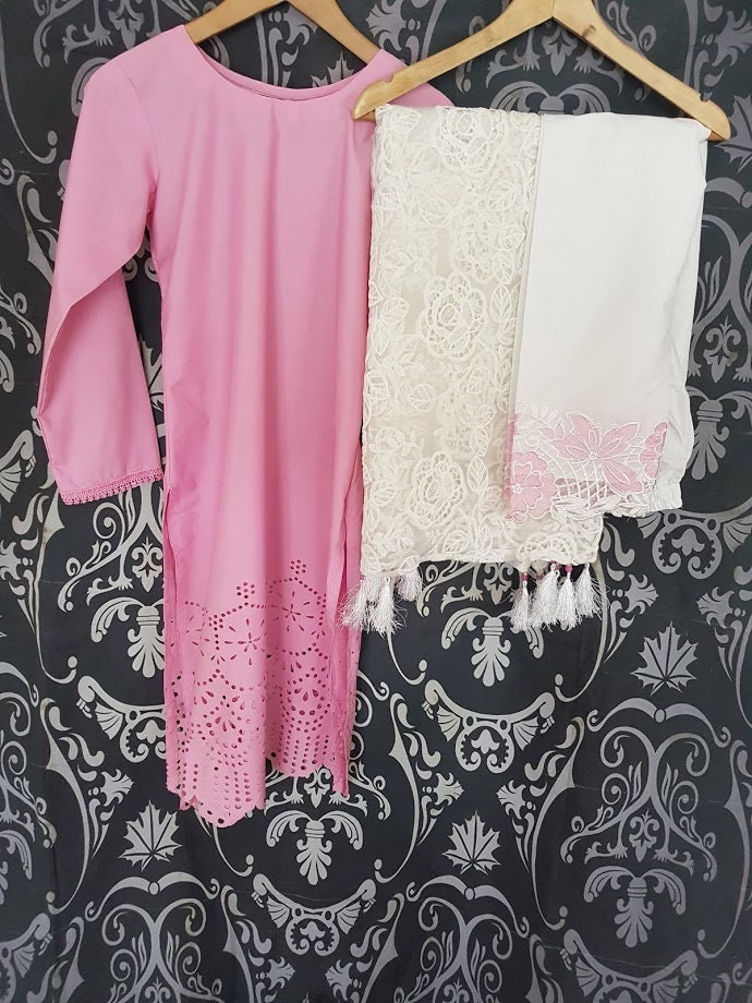 Laser Cut Pakistani Cotton Dress, Embroidered Trousers, Net Scarf