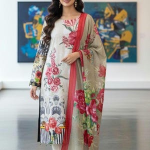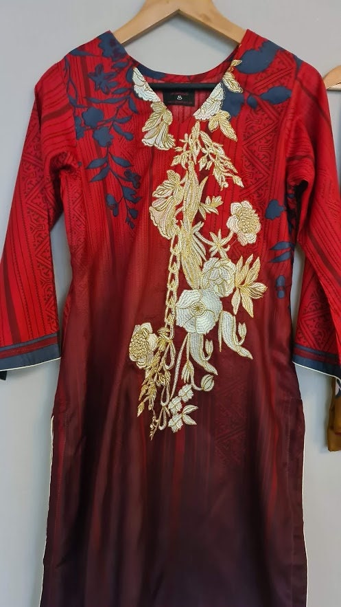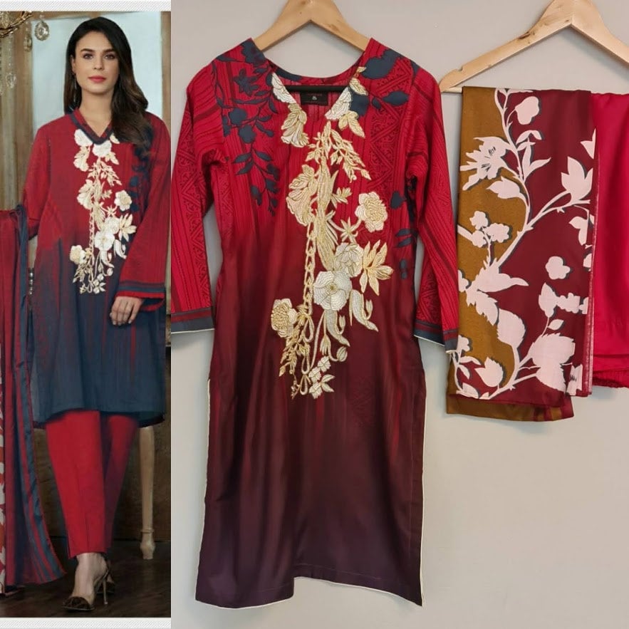 Pakistani dress Embroidered Linen Salwar Kameez Suit with shawl ethnic wear for women red